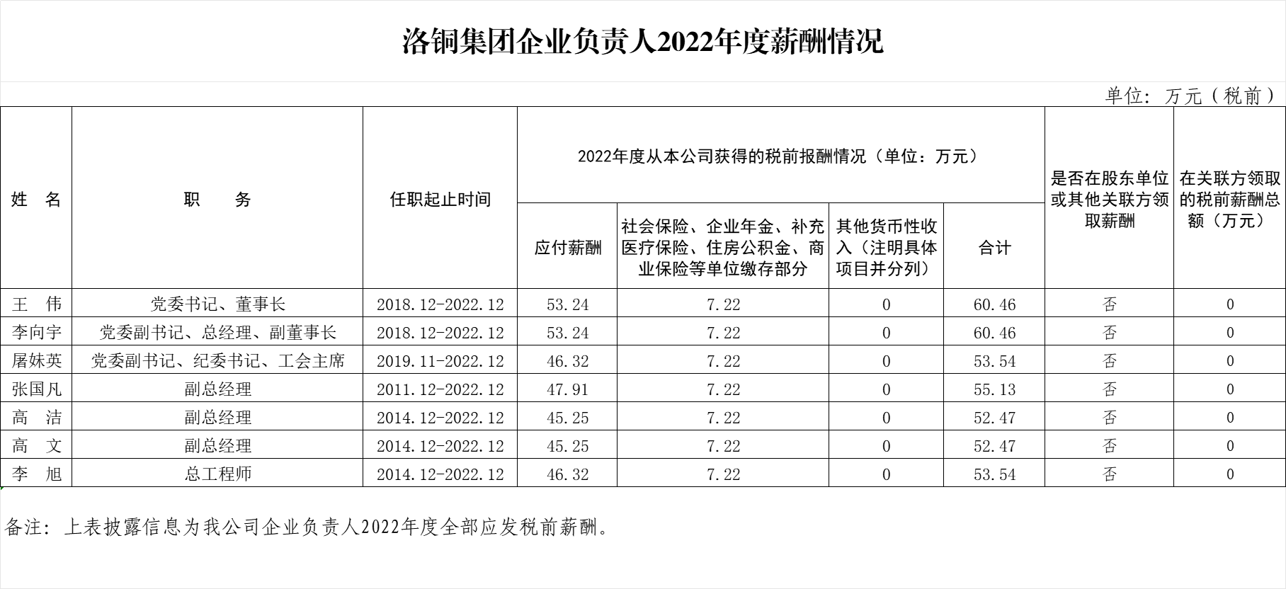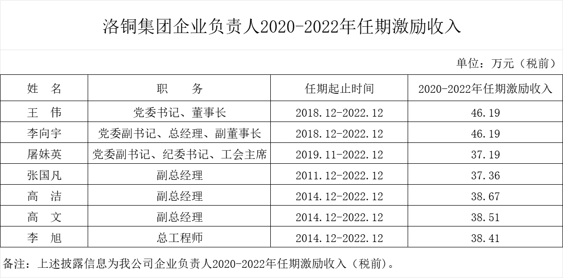洛銅集團(tuán)企業(yè)負(fù)責(zé)人2022年度薪酬情況及2020-2022年任期激勵(lì)收入信息披露